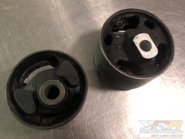 *Note – Pressing in a Mk2 Scirocco 16v transmission mounts ***** Prior to install, measure the thickness of the new mount and the OEM bracket. The new insert mount may be the same thickness of the OEM insert mount. If so, You must leave a 5 mm overhang towards the front of the vehicle (towards the mounting bolts). The Factory OEM mount is slightly thicker and were 16v Scirocco Specific. The center bushing is the same thickness and were offset from the factory. These are not. As no company is manufacturing Mk2 16v trans mounts any more, we are forced to use standard 8v mounts and the difference is approx 5mm-8mm. This will not affect the performance of the mount or cause any adverse side effects. By doing this, it will align the transmission better with the axles. See additional notes below**