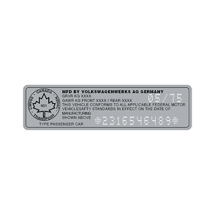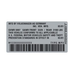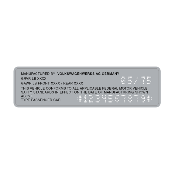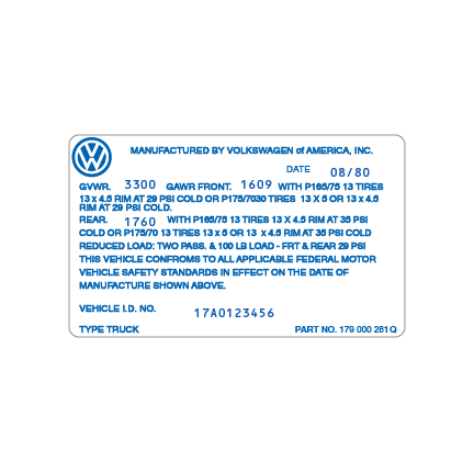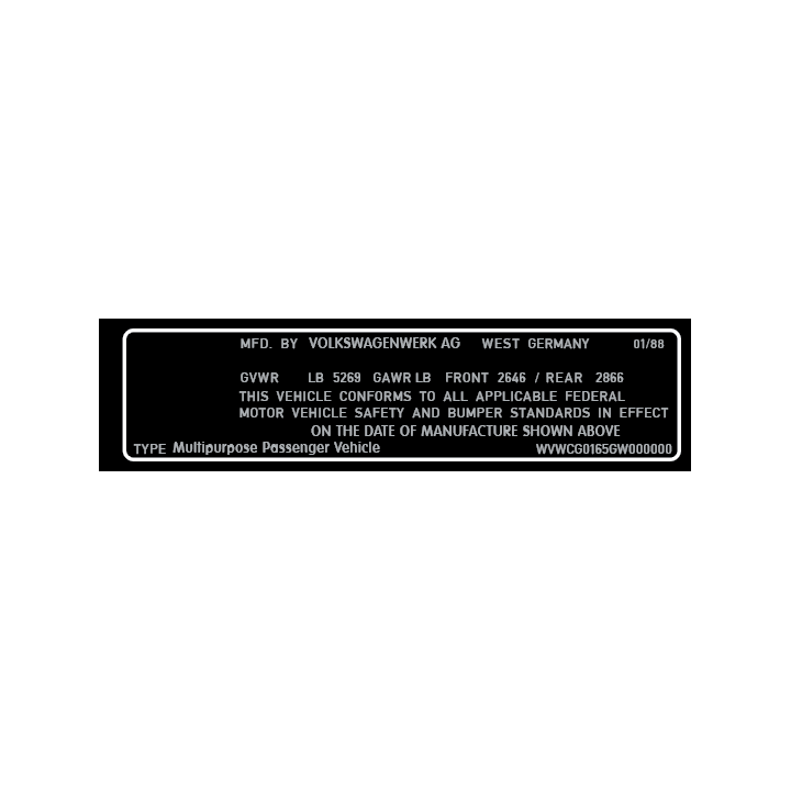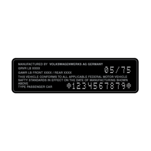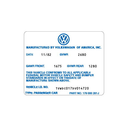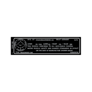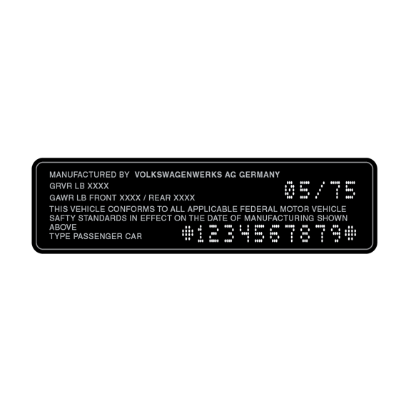 • VW made these decals in different countries, for multiple assembly plants. There maybe some slight variation between assembly plants and / or years. Not all decals are the same size (within a few mm) and some have slightly different wording. Some decals may say, Manufactured by ‘Volkswagenwerks AG’, ‘Volkswagenwerks AG Germany’, or ‘Volkswagen AG’. Some may even say West Germany. Unfortunately, we can not make every since variation of these. However, we have tried our best to represent all decals it the exact manner that represents your year and options.